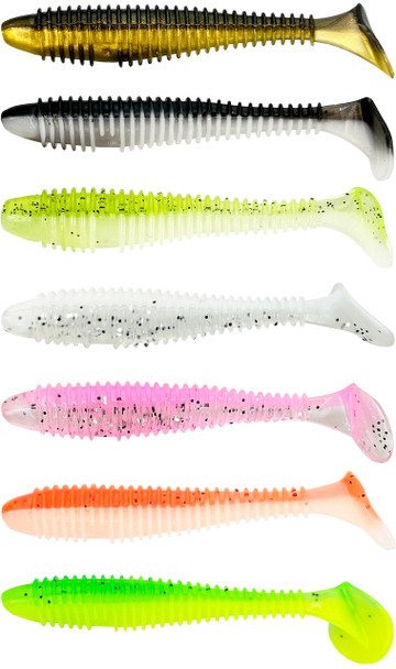 Great looking ribbed paddle tail worm. Put it on a jig head and swim it through the weeds, fish it on a drop shot rig, or use it as a trailer on a chatterbait. These have great tail action. Nice for catching large crappie.