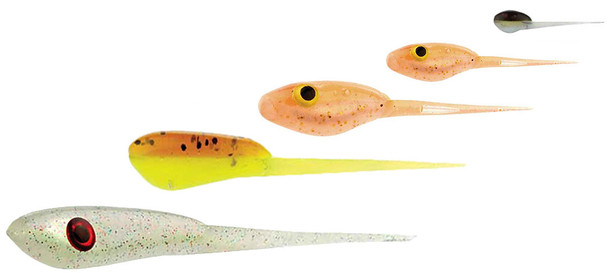 The Small Fry is an "action" profile bait with a very unique stinger tail. The tail is triangle shaped tapering from the body to almost nothing. The unique shape of the tail gives it a realistic profile, while also allowing maximum resistance and action from the taper.