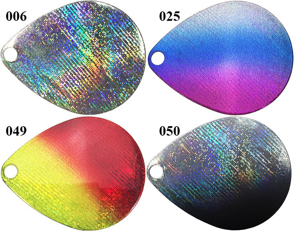 Highly reflective iridescent baitfish patterns on Colorado spinner blades.