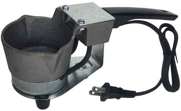 120 Volts AC, 500 Watts. A Convenient and Inexpensive Beginners Unit. Features 3" x 1-3/4", 4 Lb. Lead Capacity Cast Iron Pot, Heat Resistant Plastic Handle, Metal Stand, and Three Foot Cord.