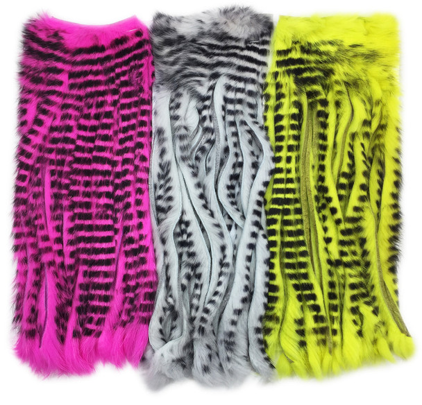 Premium quality half skin pre-cut into Zonker Strips. Bar dyed for a variegated appearance. Makes beautiful two-toned Zonkers, Double Bunnies, Sculpins, Dahlberg Divers, Tarpon Bunnies and Bonefish Flies.